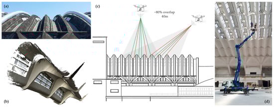 Figure 3. The tailored acquisition strategy for the undulated vault (a) made of in-situ precast elements (b) is made by integration of UAV (c) and close-range photogrammetry (d) for the intrados-extrados 3D modelling. The lighting modules and the aeration are elements challenging the 3D surface reconstruction, especially for the ray’s incidence direction (green, good, and red, bad) in photogrammetric matching (c). - 3D reconstruction of complex partially-visible objects using topography for accurate reference system. Another problem that required the extreme accuracy of the topographic coordinates of the control points is the fact that the inclined pillars of hall B (Figure 4), unlike those of pavilion C, despite being visible for most of the bays of the galleries, are incorporated in the walls of the service rooms on the ground floor;