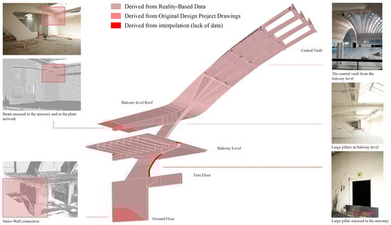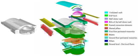 Figure 13 shows the overall model created for pavilion B, which includes both a classification of standard building parts, such as floor plans, slabs, stairs, standard-shaped pillars, vertical walls and partitions, as well as extraordinarily original structural elements conceived by Pier Luigi Nervi, from the inclined pillars of hall B, to the waved vault, to the fan-shaped structural elements, to the ribbed semi-dome of the apse [29].