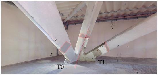 Combined view of the multi-temporal and multi-sensor data on the 3D model (dotted line separation), before and after a number of campaigns for diagnostic investigation. T0: LiDAR point cloud (acquired before the diagnostic investigation campaigns); T1: close-range photogrammetric point cloud (acquired after the first diagnostic investigation campaign).