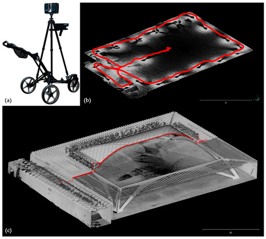 (a) FARO Swift system; (b) Segmented Swift point cloud evidencing different densities along trajectories in red line; (c) 3D vertical section of the point cloud collected with the Swift system (pavilion C).