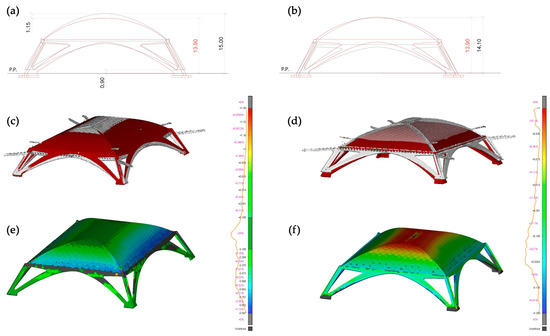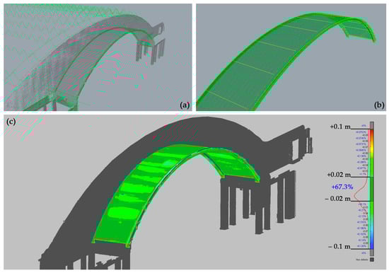 The inspection of the differences between designed and built parabolas suggested continuing the comparison on other dimensional and geometry aspects of arches and vault shapes. Surprisingly, it was found that the archival drawings known and studied so far must certainly not coincide with the final project which, therefore, evidently developed according to a slow process of approaching the final balance and harmony achieved. The comparison took place both by comparing the projections of arches and vaults and by again employing the ICP algorithms for a 3D spatial comparison between the LiDAR model and a model virtually generated starting from Nervi’s drawings, Figure 12 [29].