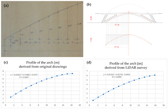Comparison between designed parabolic curves (a) and the real built arch surveyed in (b), where the red dash line represents the projection of the designed one. On the bottom, the assessment of the parabolic nature of the two curves and their equations in (c) the designed one and in (d) the achieved one. R2 quality parameter of the regression model is close to 99% in both cases.