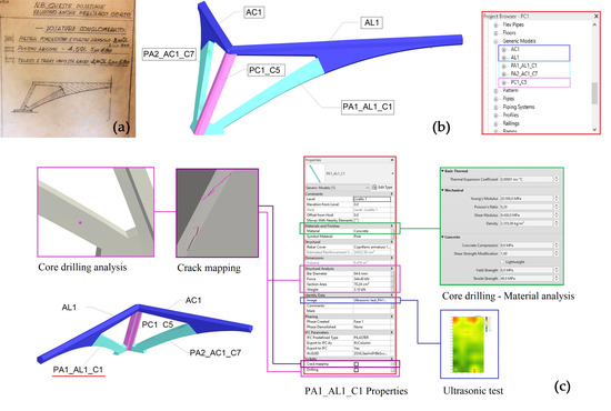The family properties related to corner combination of pillar/arches elements in hall C. (a) different conglomerated blend according to a Nervi scheme. (b) different codes assigned to the analysed element; (c) objects properties and diagnostic investigation information implemented in relation to geometric model.