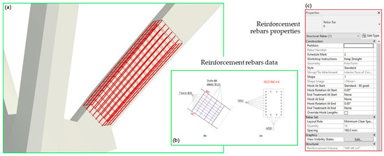 Figure 15. The inclined pillar object in the viewer (a), the reinforcement rebars’ parametric modelling (b) and related properties (c). A–B section in (b) show the reinforcement configuration.