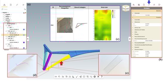 Cognitive 3D HBIM model enriched by diagnostic investigation results navigated by using an open-source IFC viewer. The inclined pillar object in the viewer (a), pointed with red arrow in the figure, and the related information n the IFC schema information in drop down menu (b). (c,d,e) are visualization data related to diagnostic investigation and reinforcement (Figure 15).