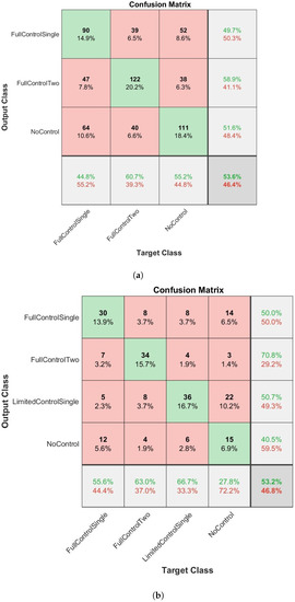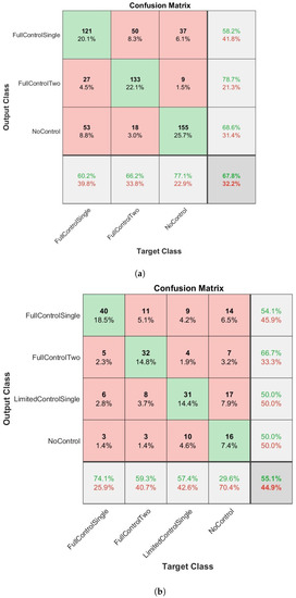 The results of the convolutional neural network (CNN) when applied to the classification of infants dexterous movement. (a) The results from the 3 label experiment. (b) The results from the 4 label experiment.
