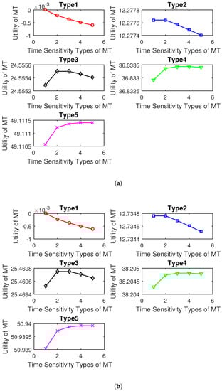 Figure 4 depicts the relationship between the utilities of the MTs (and the MEC server) and the number of MT types under different incentive mechanisms. The utilities of the MTs and the MEC server increase with the number of MT types, as shown in Figure 4b and Figure 4a, respectively. Additionally, we analyze the utilities of the MTs and the MEC server under different incentive mechanisms when the number of MT types is fixed.