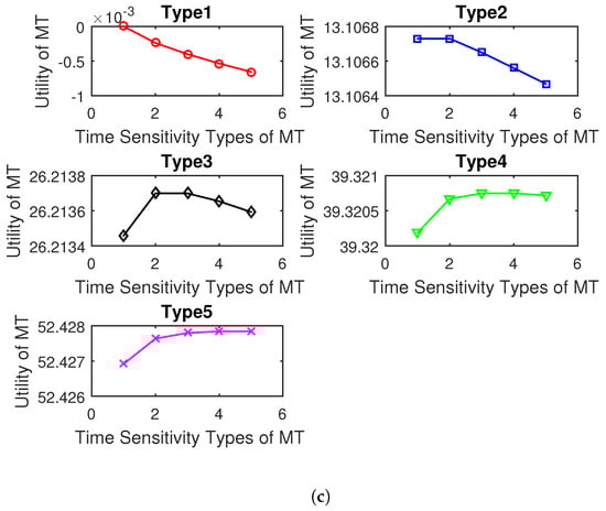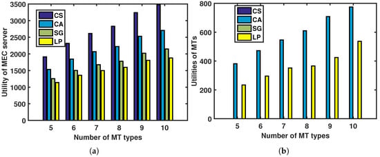 In Figure 5, the relationship between MTs’ utilities (and MEC server’s utility) and the number of service caching types is demonstrated under different incentives. The MEC server’s utility is shown to increase as the number of service caching types increases, as depicted in Figure 5a, and, similarly, the utilities of the MTs increase as well, as shown in Figure 5b.