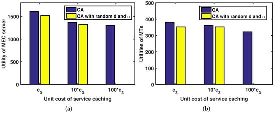 Figure 6 depicts the relationship between the utilities of the MTs and MEC server and the unit cost of service caching under the CA and CA with a random transmission power strategy d and caching strategy . As shown in the figure, the MEC server’s utility decreases while the utilities of the MTs decrease along with the unit cost of service caching. Moreover, when the unit cost of service caching is fixed, the utilities of both the MTs and the MEC server are higher under the CA approach than under the CA with a random strategies approach.