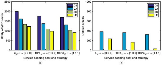 Effect of caching strategy and caching unit cost on utilities of MTs and utility of MEC server: (a) utility of MEC server; (b) utilities of MTs.