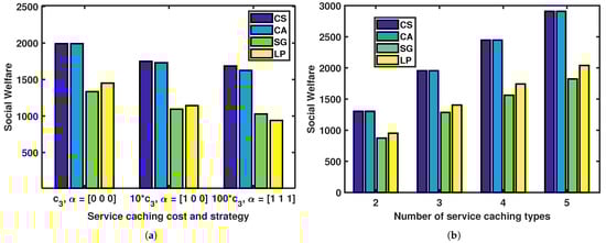 Figure 8 illustrates the effect of service caching costs and strategies and number of service caching types on social welfare. The social welfare is defined as