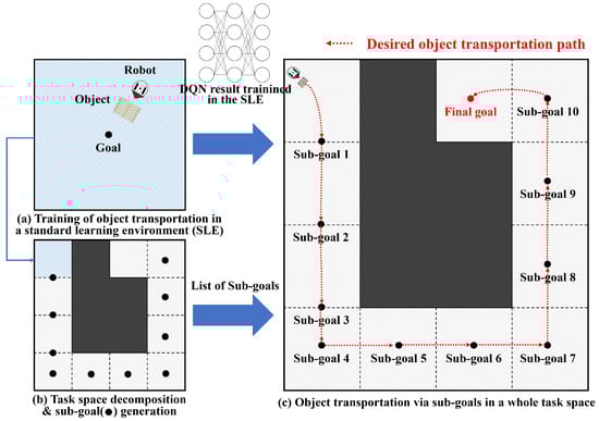 The proposed object transportation method is based on DRL and TSD. This process is performed in three steps: (1) training to transport an object in an SLE, (2) TSD and sub-goal generation, and (3) transporting an object via sub-goals in the whole-task space.
