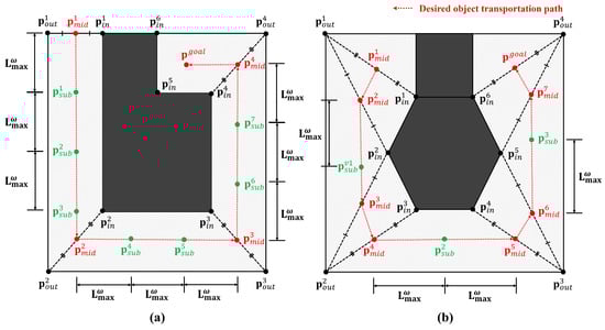 In order to divide a whole-task space into sub-task spaces, we should first compute the midpoints of the transportation path using sets of the inner and outer vertices in the test environment. Algorithm 2 shows the process of generating midpoints. First, we declared two arrays to hold the distances () and the indices () between the inner and outer vertices (line 1–2). Second, we computed the Euclidean distances between all inner and outer vertices, and inserted the results into the (line 3–5). Third, we computed the outer vertex indices of the minimum distances for each inner vertex and appended them to the (line 6–8). Finally, we computed the midpoints of the inner and outer vertices using the minimum distance pair as (line 9–11). A list of all midpoints, , is returned as the final result (line 12). Figure 3 shows two examples of midpoint generation. A list of midpoints displayed in red dots () is created by calculating the midpoints of the shortest line segment between the inner and outer vertices.