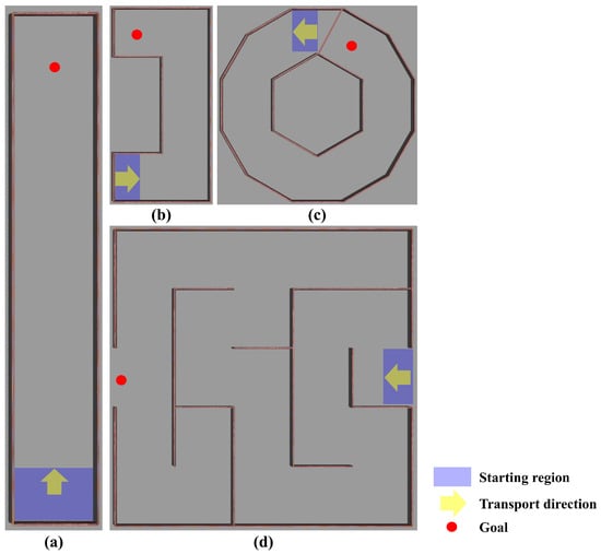 In the training phase, the SLEs are square environments of different sizes. These environments are designed to facilitate optimization and to improve convergence in the training phase. However, in the real world, there are many different sizes and shapes of environments. Therefore, we built our test environment with the following two aspects in mind: (1) sub-goal changes and (2) path length. For example, if a robot transports along a straight line, the path length is long, but the sub-goal changes are infrequent. Conversely, in a maze, the length of the segmented path is typically short, but the sub-goals change frequently and sequentially as the object is transported. In the real world, sub-goal changes and path length changes occur frequently, and thus the following environments are constructed to reflect this, as shown in Figure 5: (a) a long corridor; (b) a simple polygon; (c) a complex polygon; (d) a maze-shaped environment.