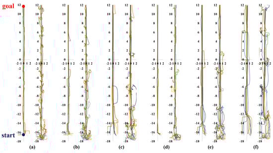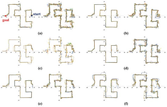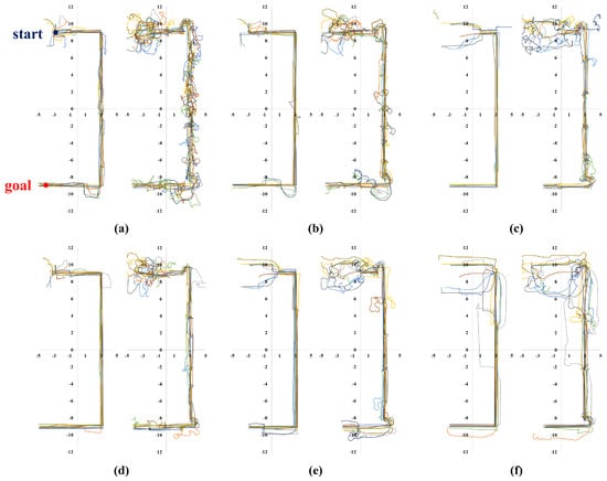 Ten trajectories of object transportation in a maze environment (Figure 5d). The left and right sides of each figure represent the trajectory of an object and a robot, respectively. (a) m and m; (b) m and m; (c) m and m; (d) m and m; (e) m and m; (f) m and m.