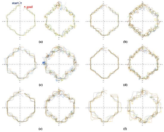 Ten trajectories of object transportation in a complex polygon environment (Figure 5c). The left and right sides of each figure represent the trajectory of an object and a robot, respectively. (a) m and m; (b) m and m; (c) m and m; (d) m and m; (e) m and m; (f) m and m.