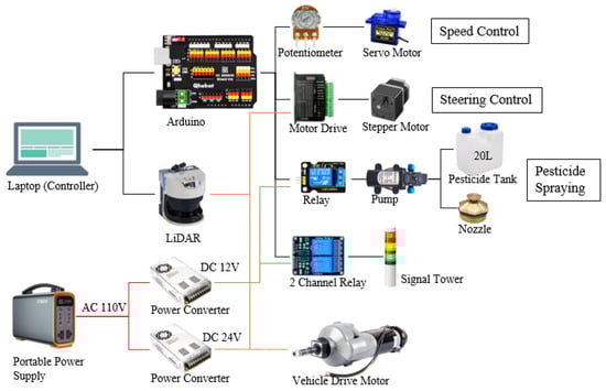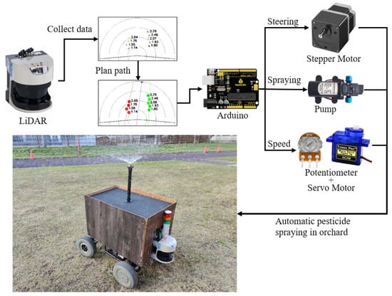 The system was developed using a microcontroller to send different commands to Arduino (UNO R3, Keyestudio, Shenzhen, China) and to control the motor, potentiometer, and spraying device to complete the task of automatic pesticide spraying in orchards (Figure 2).