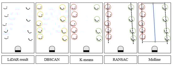 In this study, three algorithms were used to process the LiDAR-returned cloud points sequentially. First, the returned points were clustered by the density-based spatial clustering of applications with noise (DBSCAN) to find the tree trunk position. K-means was used to discriminate between the left and right sides of the tree. Two straight lines were calculated as the boundary lines using random sample consensus (RANSAC). Finally, the midline was calculated as the planning path for navigation (Figure 4).