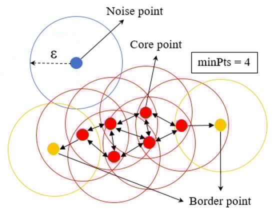 DBSCAN is a density-based clustering algorithm consisting of two parameters: the radius ε and the minimum number of points minPoints. Through DBSCAN clustering, the points were classified as core points, border points and noise points. The neighborhood of p was the set of neighbors within distance ε, denoted by Nε(p). The number of points in p’s ε-neighborhood was denoted by |Nε(p)|.