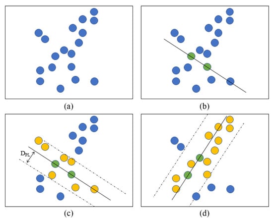 Diagram of the RANSAC algorithm for determining the boundary line of cloud points received from the 2D LiDAR system. (a) Cloud points that need to be clustered. (b) Randomly select two points to make a line L. (c) The distance D from data points to line L was calculated, if D < DPL, the point was in line (yellow point); otherwise, it was classified as out of line (blue point). (d) After several iterations until ProT_current was greater than the set ProT, the calculation was completed.