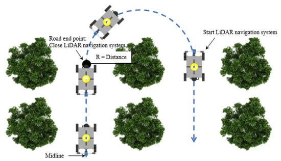 The vehicle was guided at the forward speed until it reached the end of the tree rows, and the number of tree trunks was not enough to use the above method for trajectory planning. In this study, when the vehicle was operated at the road end point (the midpoint of the last two trees), the vehicle steering angle was set based on the distance to the trunk from the LiDAR system (Figure 8). Vehicle steering was started, and the LiDAR system continued to scan the surrounding environment information. DBSCAN and K-means were used to continue to distinguish the location of the surrounding trunks. Until the vehicle was turned to the next road in which the left and right sides obtained enough points returned from the tree trunk, the steering ended and continued to operate according to the path planning algorithm.