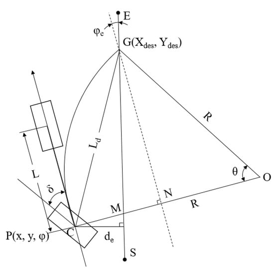 In the pure pursuit tracking system, the robot’s current position was represented by P(x, y, φ), de was the trajectory tracking horizontal error, φe was the heading error, and θ was the change angle while the robot was steered to the target point G. Based on the geometric relationship, it can be determined that: