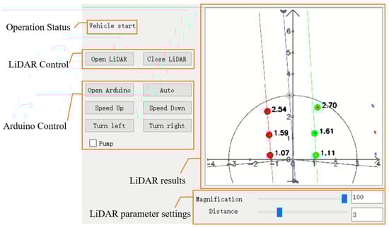 This study used C++ programming on Visual Studio 2017 to achieve communication with LiDAR and Arduino. To facilitate control and make the results more intuitive, Qt® was used to build the graphical user interface (GUI). The GUI included control buttons for LiDAR and Arduino, showing the program operation status and LiDAR planning path result and the setting of LiDAR parameters. The magnification and scanning range of the LiDAR result image could be modified by sliding. The black circle in the result image represents the scanning range, and only the data inside the circle are used for path planning (Figure 10).