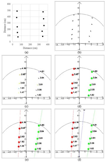 After K-means classification, the points on the left and right sides were brought into the RANSAC algorithm to obtain the boundary lines on each side (Figure 12e). RANSAC could determine which cones were inline based on the location of the cones, and those cones could be used to calculate the path, while those outside the line would be regarded as noise points and not brought into the calculation; thus, this algorithm needed more than three points to obtain results. Finally, the midline was calculated as the planning path (Figure 12f).