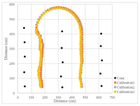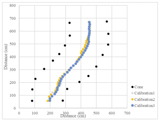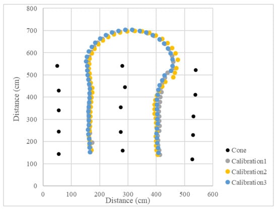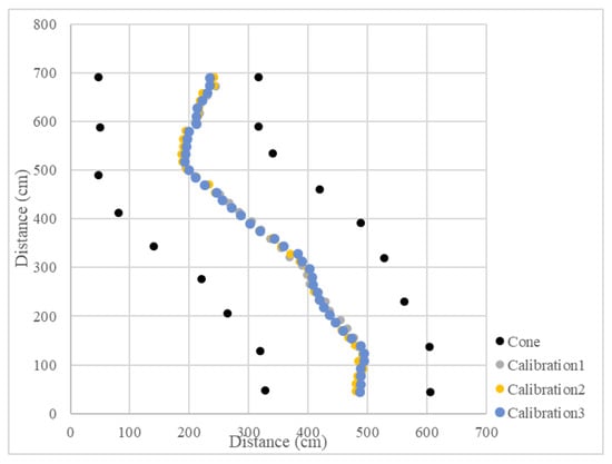 This calibration was conducted on a concrete road using cones instead of tree trunks. The positions of the cones simulated the planting of trees in an orchard, approximately in a line vertically, and the trunks were not in the same line horizontally (Figure 11).