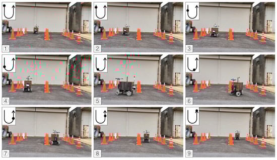Images of vehicle operation on the concrete road (right turn). Subfigures (1–9) in order were the vehicle’s movement path.