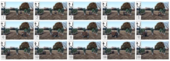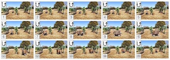 Images of vehicle operation in the facilitated artificial-tree-based orchard (left turn). Subfigures (1–15) in order were the vehicle’s movement path.