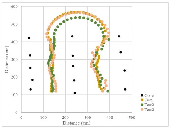 To test the availability of the algorithm, the first calibration procedure was completed on a concrete road. A curved route was selected using 18 cones placed on two sides, and the vehicle was guided along the travel path based on the cone positions detected in real time. In the curve path correction, the detection distance of the LiDAR system was set to 2 m due to the close workshop. The radius ε of the circle of DBSCAN was set to 0.2 m and the minPoints was set to 3. The value of K for K-means was 2. The maximum operation times Max_Number of RANSAC was 300, the inline point proportion threshold (ProT) was 0.6, and the distance from the point to the line (DPL) was 0.05 m. The system calculated the steering angle by using the pure pursuit tracking method based on the objects’ position returned by the LiDAR system, iterated by incremental PID to obtain the current required steering angle and transmitted to Arduino. According to the experimental results, the vehicle reached the end point and turned in the right (Figure 13) and left directions (Figure 14).