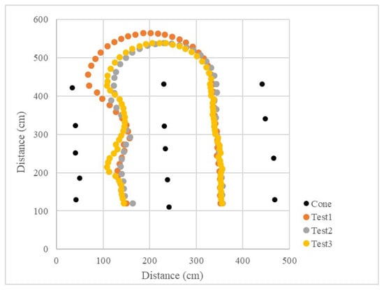 In the calibration test, 15 cones were placed in three columns to simulate the environment at the end of the orchard. In the test, the LiDAR detection distance was set to 3 m, only the cones on the left and right side could be detected, and the cones in the next column would not affect the planning path. Other parameters were kept the same. When the vehicle was moved in a straight line, the navigation system determined the planning path according to the real-time returned cone position data and moved along the path at a forward speed. When the number of cones on both sides was detected to be insufficient, the current position of the vehicle was close to the end of the orchard rows, and the vehicle would travel toward the midpoint of the last two cones. After reaching the midpoint, the steering angle was calculated based on the distance of the steering center cone, and the steering angle was maintained until reaching the second and third columns of the cones. When the LiDAR system detected enough scanning returned points again, the vehicle navigation system was enabled again using the LiDAR system. In the right-turn (Figure 17) and left-turn (Figure 18) tests, the cones were placed in the same position, and the vehicle was able to complete straight maneuvers and U-turns and stopped at the end of the path. The three routes were tested for right and left turns of the vehicle and recorded (Figure 19 and Figure 20). The three position RMSEs in the right turn calibrations on the concrete road were 10.4 cm, 14.6 cm, and 10.9 cm, and the average value was 12.0 cm. For the left turn, the calibrations were 12.0 cm, 11.2 cm, and 11.7 cm, and the average value was 11.6 cm (Table 1).