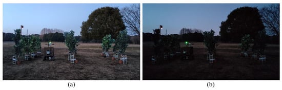 Experiment in the facilitated artificial-tree-based orchard under low-light conditions. (a) was experiment at 5–6 pm. (b) was experiment at 6–7 pm.