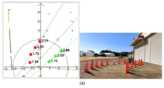 In the calibration, the cones were placed randomly in two columns (Figure 12a). The vehicle was placed tilted, and the detection distance was set to 5 m. The points returned by the LiDAR system were only distance information, and the information was displayed in the interface through the calculation of the angle with the sending infrared signal (Figure 12b).
