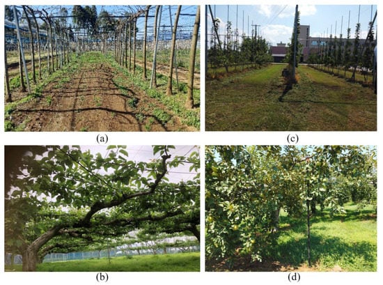 New trends and conventional orchards in Japan. (a) Initial stages of the joint tree training system for pears at the T-PIRC, (b) conventional orchard at the T-PIRC for pears covered with nets, (c) row-based vertical cordon training system at the apple research center in Aomori Prefecture in Japan, and (d) conventional apple orchard at the apple research center in Aomori Prefecture in Japan.