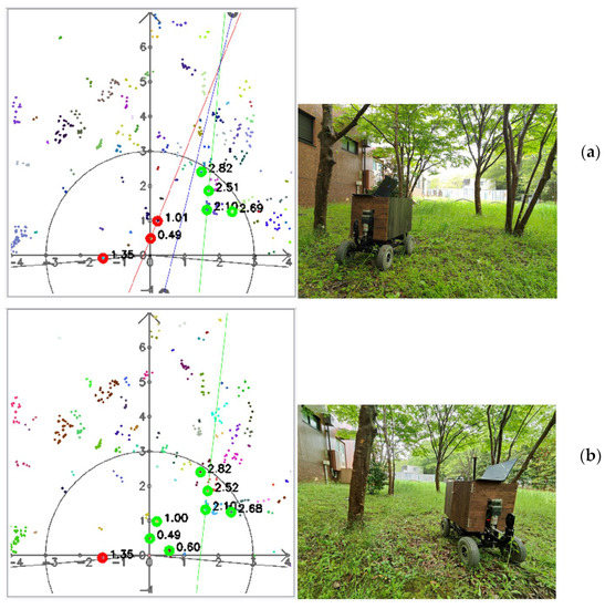 The trees in the orchard are linearly arranged, and using K-means, the system can clearly classify the trees into left and right rows (Figure 12d); red is the tree on the left side, and green is the tree on the right side. While the vehicle was steered, the K-means algorithm could classify accurately. Because the scanning range was 5 m, even the clusters divided by DBSAN were not included in the path calculation.
