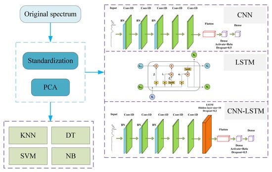 The flowchart of the study for this experiment is shown in Figure 1. The aim of this experiment is to normalize the raw IR spectra of pasta or extract the spectral features using principal component analysis (PCA), process the spectral data, and input them into traditional machine learning and deep learning models for analysis.
