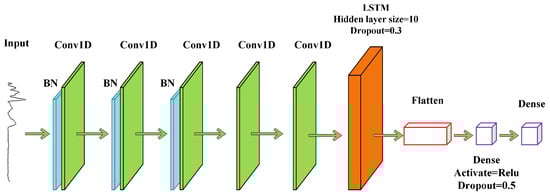 The combination of CNNs and recurrent neural networks (RNNs) has had several research applications and has recently yielded significant results in the following areas: in the field of natural language processing, such as sentiment analysis and speech recognition [,]; in real-time data prediction, such as stock prediction [,], human energy consumption [], and air pollution prediction [,]; and in computer vision, for modal frequency detection in computer vision []. The CNN reduces parameters through weight sharing to improve the model learning efficiency. In addition, the LSTM is a recurrent network model which solves the long-standing gradient explosion and gradient disappearance problems in the RNN [].