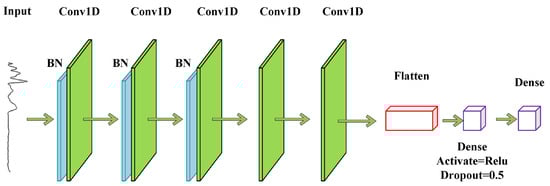 The 1D-CNN constructed in this paper utilized the Alexnet framework, and the structure of the 1D-CNN model is shown in Figure 3. Alexnet is a classical deep learning model that contains an 8-layer transform with 5 convolutional and 2 fully connected layers and a fully connected output layer. Alexnet adds the Rectified Linear Unit (ReLU) activation function after each convolutional layer, which makes Alexnet use a random discard technique to selectively ignore neurons in the fully connected layer during training to avoid overfitting the model [].