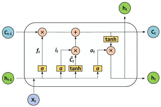 An LSTM is a recurrent neural network model that solves the long-standing gradient explosion and gradient disappearance problems of RNN models []. The LSTM units are shown in Figure 4, and the work of each LSTM unit in the architecture can be described as follows. For any input of spectral data, the LSTM model generates a hidden activation , expressed by Equation (5). In the next step, each piece of spectral data is input and further utilized for prediction. The LSTM model defines the transformation relation of the hidden representation through the LSTM unit, which accepts the input in the current state and the acquired information . Thus, when our LSTM network inputs spectral data, it processes the data and passes the inherited information to the next step.