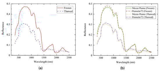 As shown in Figure 5a, the spectra of “frozen pasta” showed higher reflectance values than that of “thawed pasta” in the following spectral ranges: 350–1450 nm, 1600–1850 nm, and 2100–2400 nm. The average spectra of the frozen pasta products showed more significant absorbance around 1450–1550 nm and 1900–2100 nm. As shown in Figure 5b, for the thawed pasta in the range 1300–2500 nm, the pasta product Pennette72 showed higher reflectance values than Mezze Penne, while the reflectance values of both products in the frozen state were almost identical.
