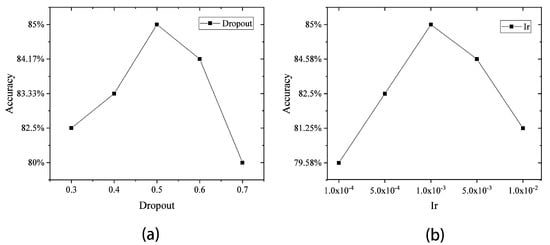 (a) Accuracy rate of the CNN with different dropouts; (b) accuracy rate of the CNN under different Ir.