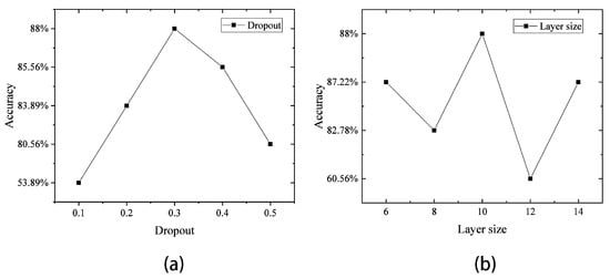 (a) Accuracy rate of the LSTM with different dropouts; (b) accuracy rate of the LSTM under different layer sizes.