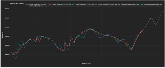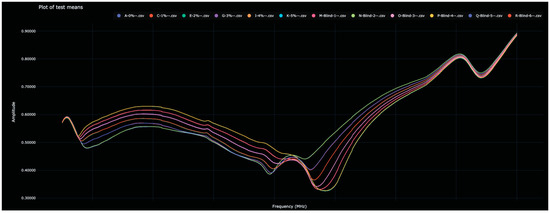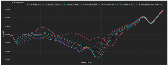 As stated above, each of the blinded solutions was correctly identified in the test data. Table 2 shows the distance between the 0% water solutions and all other solutions (in both the training and test data). The Bio-RFID signals across the frequency range are shown in Figure 1.