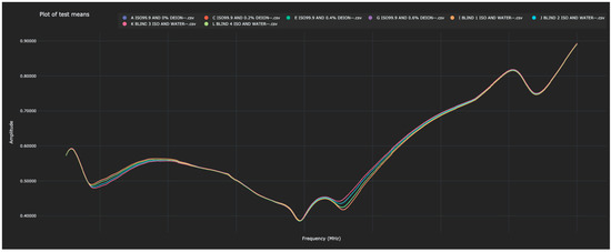 Once again, each of the blinded solutions was correctly identified in the test data. Table 3 shows the distance between the 0% water solutions and all other solutions (in both the training and test data). The Bio-RFID signals across the frequency range are shown in Figure 3.