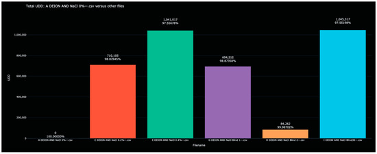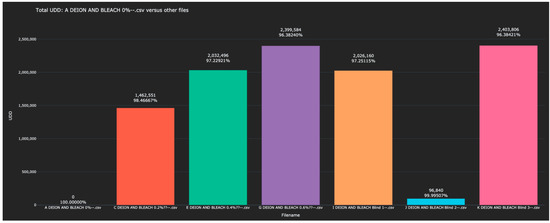 When calculating the distance between each scanned solution and the 0% water solution, a natural ‘matching’ was clear. For example, the distance to the 2% water solution was 1,917,048, while the distance to Blind-6 was 1,910,652. Since no other value was close, Blind-6 was identified as 2% water. Other identifications proceeded similarly. Further reflections on this table appear below in the Discussion section.