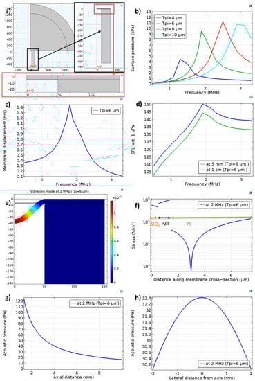 COMSOL simulation of a single PMUT element underwater: (a) Simulation geometry with zoomed−in views. The PMUT axis is indicated by r = 0, where r is the radial coordinate. (b) Simulation of surface pressure response with polyimide thickness as a parameter. For the PMUT element with 6 µm polyimide, (c) membrane displacement and (d) on−axis sound pressure level (SPL). Additionally, at 2 MHz, (e) vibration mode and (f) stress in the membrane along the axis of the PMUT, as well as (g) pressure decay with axial distance and (h) lateral pressure distribution at 5 mm.