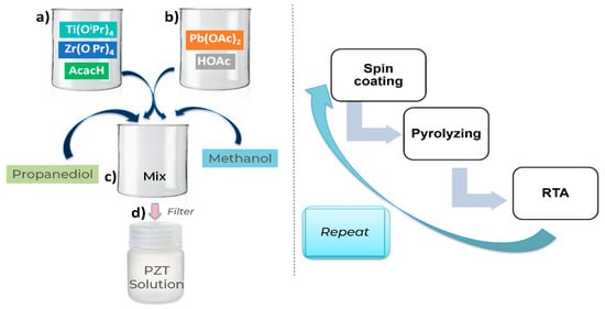 Left: recipe of making PZT solution—(a) In a beaker, Zr and Ti precursors are refluxed with acetylacetone in stochiometric amounts. (b) In another beaker, 10% of excess Pb precursor is refluxed with acetic acid. (c) Mixing the two solutions is followed by the addition of a sol stabilizer and solvent. (d) Mixing and filtration of the solution in a stock bottle. Right: PZT thin film deposition procedure: spin coating, pyrolysis, and RTA are repeated 4 times in a cycle.