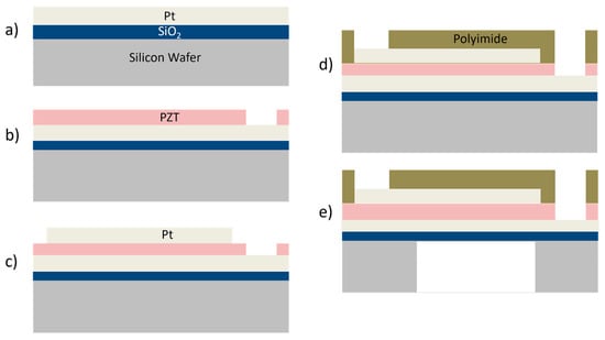 The 100–silicon wafer was prepared with 500 nm of oxide via wet oxidization in an oxidation oven. This was followed by sputtering for the 200 nm Pt bottom electrode. The oxide serves as an etch stop in the final DRIE process, whereas (111) oriented Pt serves as a seed layer for the PZT deposition process. Using the sol–gel method, 1 µm PZT was deposited on top of the Pt bottom electrode. The PZT was patterned using a previously reported wet etching procedure to access the bottom electrode [26]. Then, the top Pt layer was patterned using the liftoff for the electrodes covering a width of about 70% of the membrane diameter and for the interconnects. Once the active layers were prepared, polyimide (PI2611, HD Microsystems) was spun to serve as the membrane material and was patterned to access both electrode pads. Finally, the wafer backside was patterned using DRIE to realize the membranes and complete the fabrication. The fabrication process flow is shown in Figure 4, whereas the summary of materials processing involved in the fabrication is presented in Table 2.